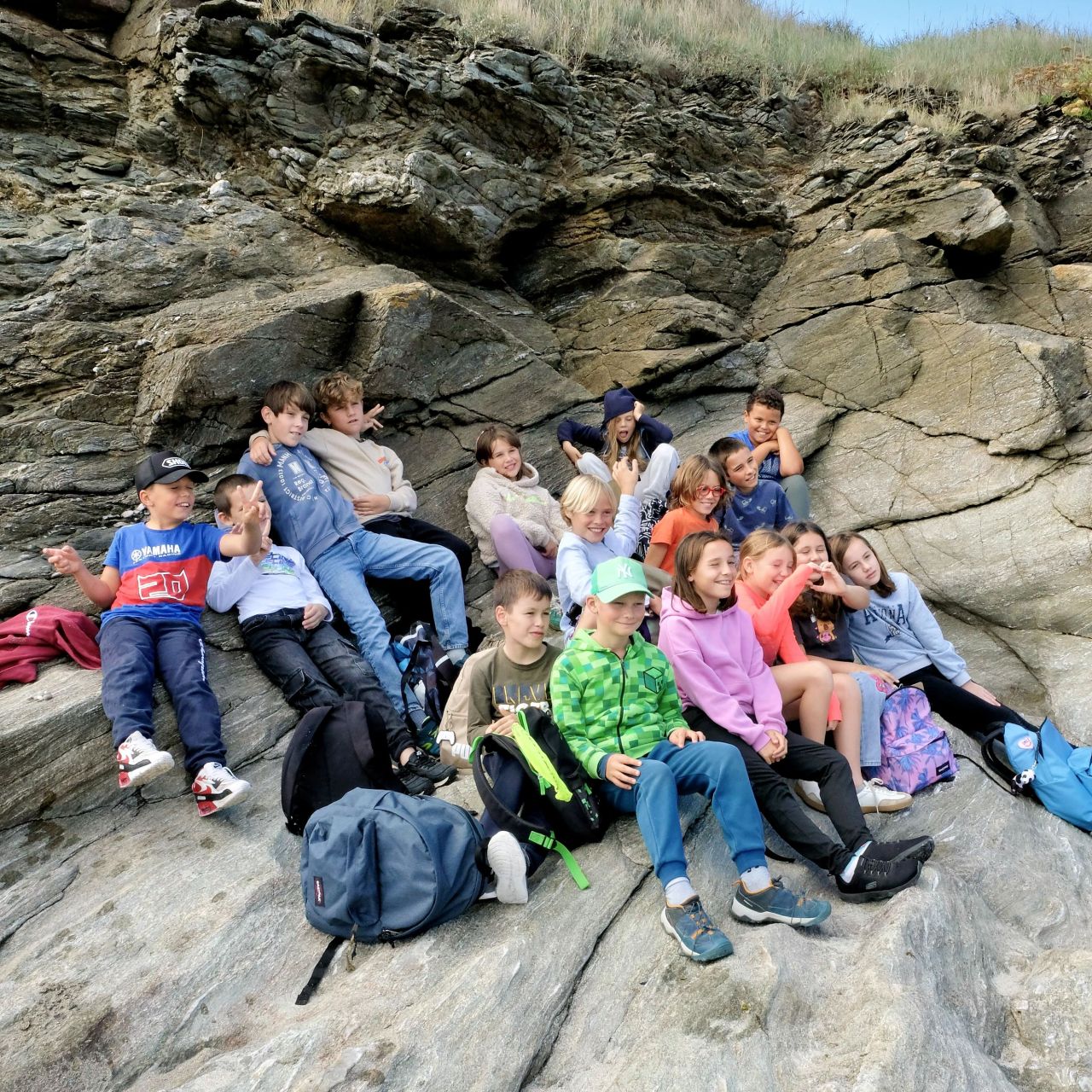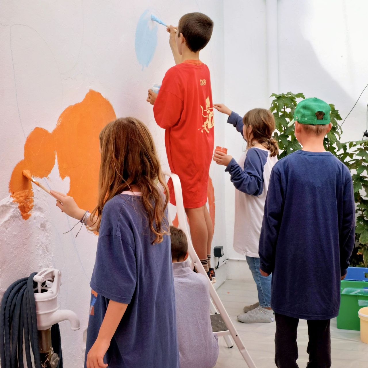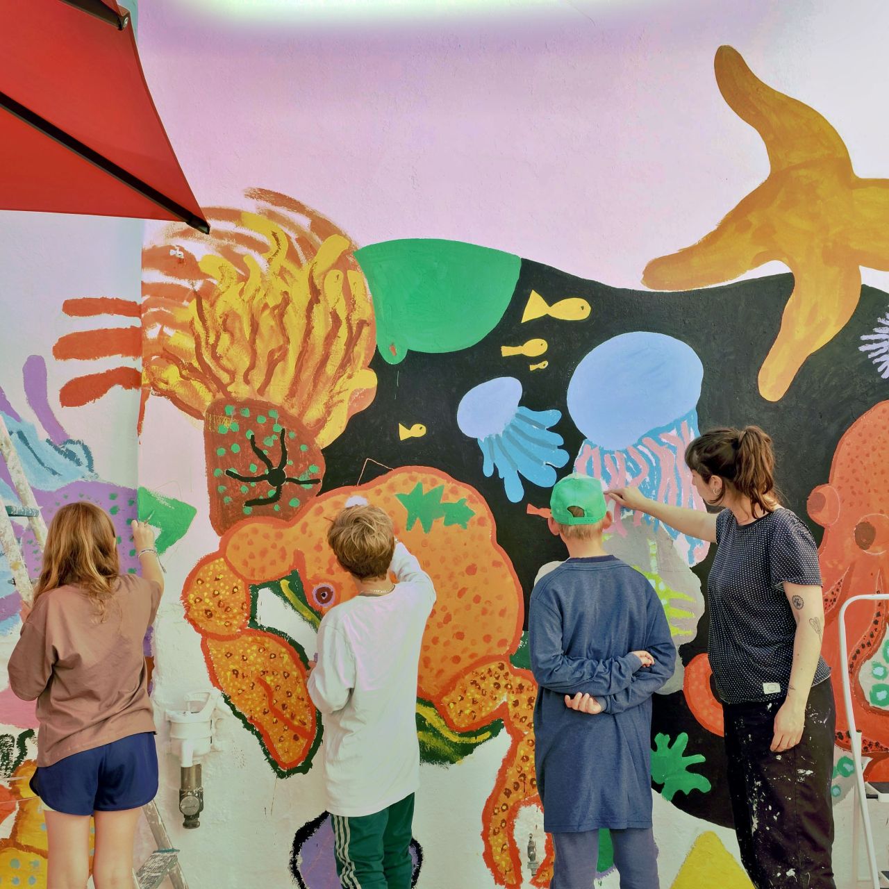Les élèves de CM1 CM2 ont eu la chance de participer à la création d'une fresque avec l'illustratrice Anne Zeum en résidence à Groix grâce à l'association A La Ligne.